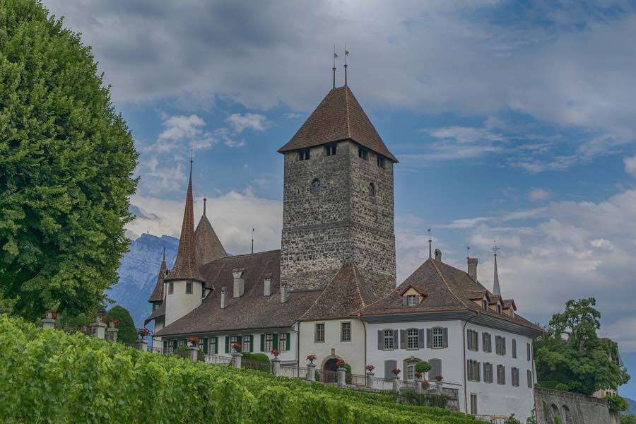 Spiez Castle is a very old castle dating back to the 11th-century and overlooks the town of Spiez, surrounded by vineyards, and an excellent view of Lake Thun.