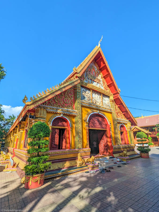 The temple’s architecture reflects traditional Lao design, with intricate carvings, colourful murals, and gilded decorations adorning its structures.